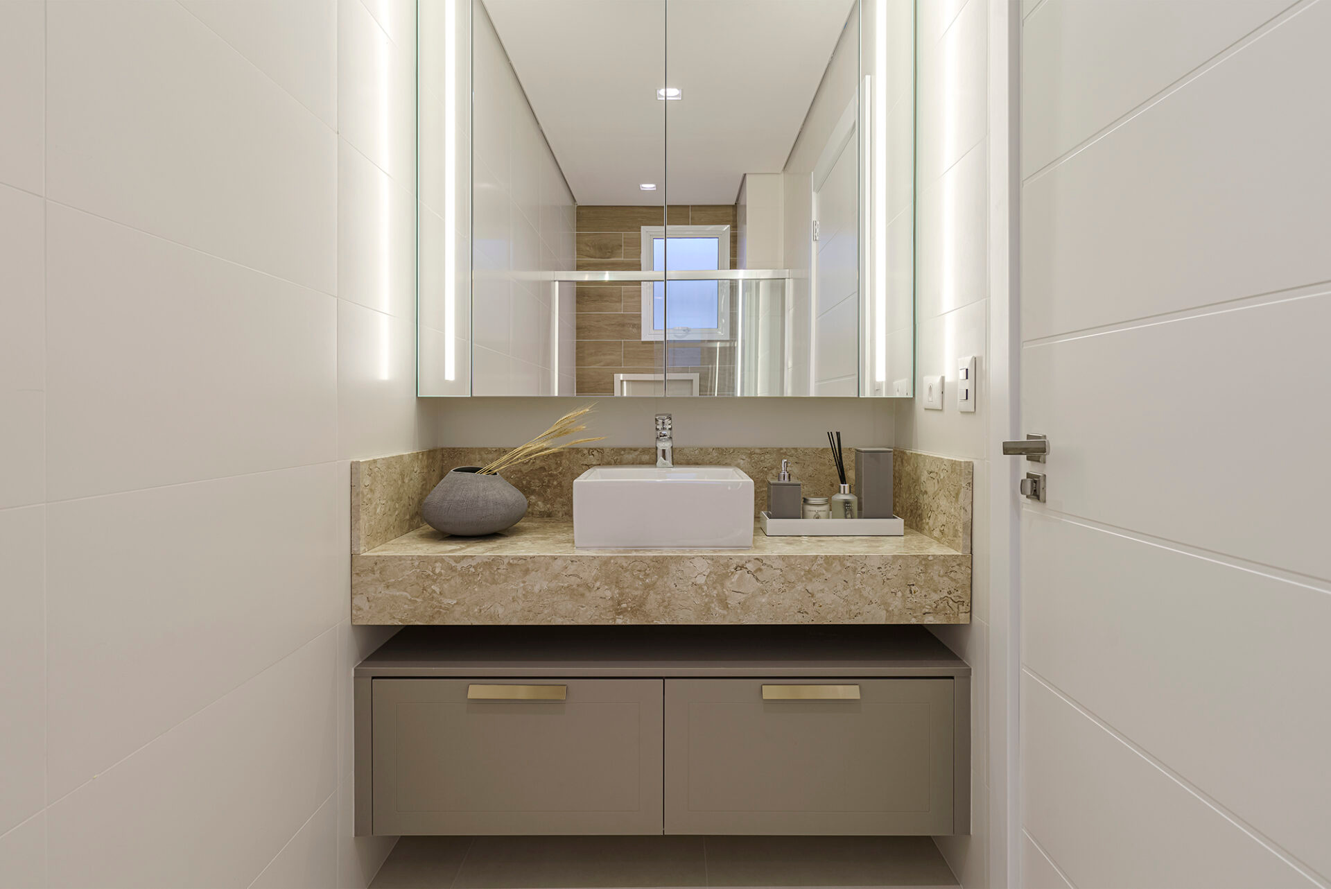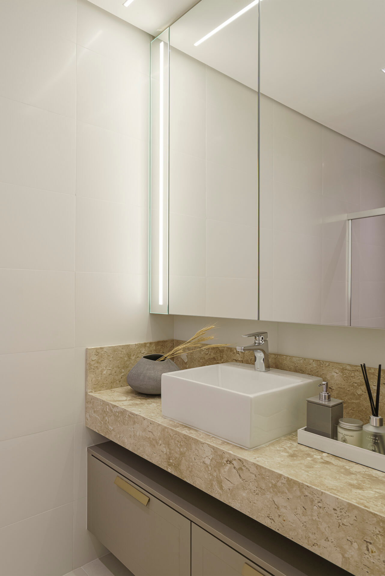 BANHEIROS COM DETALHE EM PORCELANATO NA PAREDE;